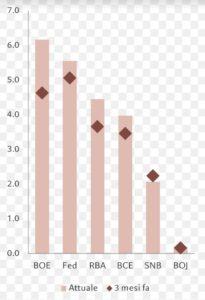 Fig. 1 – Picco previsto dei tassi di riferimento per le principali banche centrali, oggi vs 3 mesi fa, %