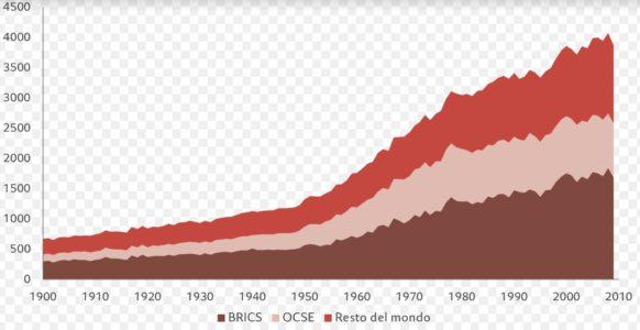 Utilizzo di acqua dolce per area economica, miliardi di metri cubi, 1901-2020