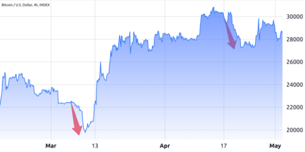 Sopra, scopriamo che il primo calo si è verificato tra l’8 e il 10 marzo, con conseguente diminuzione dell’11,4% del valore di Bitcoin a 19.600 dollari. Questo era il livello più basso in oltre sette settimane in quel momento. Questa correzione ha fatto seguito alla liquidazione di Silvergate Bank, un partner operativo cruciale per molte società di valuta criptata.