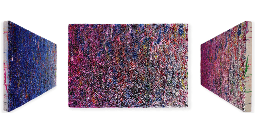 In quest’ultima collezione, Zhuang ha sviluppato la tecnica di lavorare con un singolo colore uniforme, fino alla creazione di opere a doppio e triplo colore che passano sottilmente da un colore dominante a un altro mentre ci si muove da un lato all’altro dell’opera, aggiungendo movimento e una sorta di tattilità visiva alle opere.