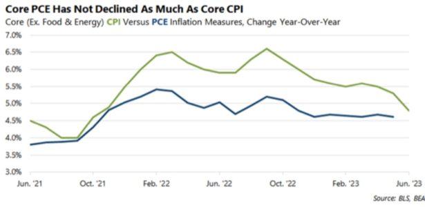 Riconosciamo che il CPI core ha effettivamente registrato un’impressionante disinflazione nell’ultimo anno, raggiungendo un picco del 6,6% su base annua nel settembre 2022 e terminando a giugno con una lettura del 4,8%. Ancora più impressionante è il fatto che la “disinflazione” si è verificata mentre il tasso di disoccupazione è rimasto vicino ai minimi del ciclo, un’impresa che molti investitori, commentatori e storici dell’economia ritenevano “impossibile”. Tuttavia, anche a circa il 5%, l’inflazione è ben al di sopra dell’obiettivo della Fed. Inoltre, altri indicatori dell’inflazione sottostante non si sono raffreddati quanto il CPI core[1]. Il PCE core, l’indicatore preferito dalla Fed, è sceso di soli 0,6 punti percentuali, dal 5,2% al 4,6%, negli ultimi otto mesi.