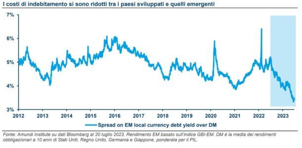 La Fed e la Banca Centrale Europea, invece, continuano a subire pressioni al rialzo sui loro tassi. La prospettiva di un imminente taglio dei tassi d’interesse ha contribuito a ridurre il divario tra i costi di finanziamento dei governi dei paesi sviluppati e quelli dei paesi emergenti, che ha raggiunto il livello più basso dal 2007 e dovrebbe fornire un impulso alle obbligazioni emergenti in valuta locale, soprattutto in America Latina.