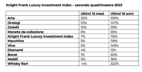 Secondo il Luxury Investment Index di Knight Frank (KFLII), che analizza l’andamento di 10 tipologie di beni di lusso da collezione, la prima parte dell’anno non è stata particolarmente performante. In 12 mesi, fino a giugno 2023, l’Indice e i suoi beni hanno subito un incremento moderato, in media del 7%, in linea con il momento storico e le incertezze di mercato.