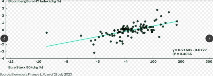 In alternativa, l’high yield può fungere da strumento per moderare il rischio se utilizzato in sostituzione delle azioni. Il confronto tra l’indice Bloomberg Liquidity Screened Euro High Yield Bond rispetto all’EURO STOXX 50 mostra una correlazione ragionevole, vicina al 64%, ma un Beta di appena lo 0,2151. I rendimenti sono quindi allineati positivamente, ma sono solo meno volatili.