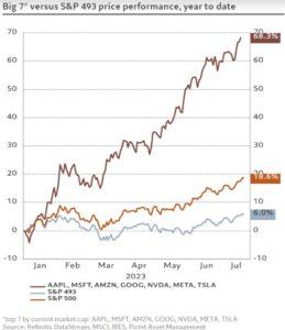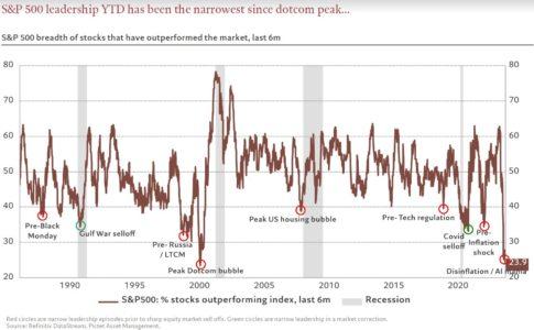 La leadership ristretta descrive uno scenario di mercato in cui solo alcuni settori o titoli selezionati dominano la performance, mentre il mercato più ampio è in ritardo. Ne è un esempio l’attuale mercato azionario statunitense, con i “magnifici 7” che vantano guadagni significativi rispetto alla crescita moderata del mercato complessivo. Sebbene la predominanza di questi titoli non sia ancora indicativa di una bolla, una leadership così concentrata può rendere il mercato vulnerabile ai cambiamenti di sentiment e agli shock esterni. In passato, eventi come il “lunedì nero”, LTCM, la GFC e il crollo delle dot-com hanno visto una leadership ristretta precedere correzioni significative del mercato.
