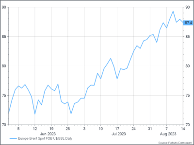 A partire dalla fine di giugno, la tendenza al rialzo del prezzo del petrolio sembra non avere fine: il prezzo spot del Brent Crude Oil, misurato in dollari al barile ($/bbl), è passato dai $74,5/bbl della fine di giugno, agli $87,4/bbl del 14 agosto 2023, mettendo a segno un aumento del 17,32% in poco più di un mese (Figura 1).