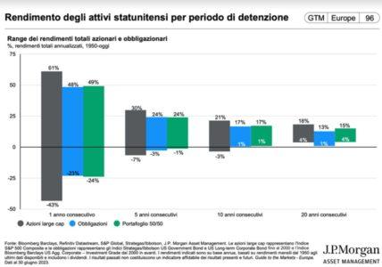 Dal 1950 ad oggi, detenere per almeno 5, 10 e 20 anni un portafoglio composto sia da azionario che obbligazionario avrebbe garantito un spettro di rendimenti più limitato rispetto all’investimento in (alcune) singole azione od obbligazioni e un ritorno maggiore o uguale alla detenzione di soli titoli obbligazionari: un range dal -1% al 24% a 5 anni contro un range dal -3% al 24% delle obbligazioni e un range dal 4% al 15% a 20 anni contro un range dall’1% al 13% delle obbligazioni negli stessi orizzonti temporali (vedi grafico sotto, fonte: JP Morgan). Certamente i rendimenti passati non sono garanzia di rendimenti futuri e probabilmente il portafoglio multi-asset non è la risposta a tutti gli scenari di mercato o a tutte le categorie di investitori, ma è anche vero che, spesso, la soluzione più semplice può rivelarsi anche quella più efficace.