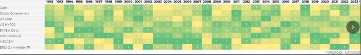 Il grafico sotto mostra il posizionamento annuale di otto asset class nel tempo, dal 1992 a luglio 2023 (fonte: Elaborazione Moneyfarm su dati Bloomberg). Azionario e obbligazionario sono a loro volta soggetti ad ampia diversificazione in base ad aree geografiche, tipologia e merito creditizio delle emittenti, scadenze, valute e settori.