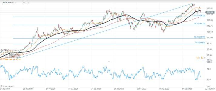 Grafico delle azioni Apple (AAPL.US), D1. Il primo importante livello di supporto nello scenario al ribasso sembra essere intorno ai $ 165, dove vediamo il 23,6% del ritracciamento dell’onda ascendente di marzo 2020 e la media principale, che teoricamente definisce la tendenza: SMA200 (colore rosso). Fonte: piattaforma XTB