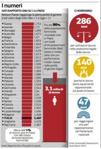 “Quanto alla posizione dei singoli Stati” ribadisce il Corriere “l’Italia è collocata molto male, perlomeno rispetto alle 31 nazioni con i migliori risultati di empowerment e di gender gap tra cui i maggiori Paesi europei oltre a Usa, Canada, Australia e Singapore. Il nostro Paese è al 29esimo posto, seguito solo