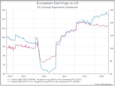 Utili e aspettative sugli utili si sono dimostrati sorprendentemente resilienti, nonostante i dati macro avversi, a conferma del fatto che i mercati potrebbero già aver scontato il rallentamento economico previsto per i prossimi mesi. A fine 2022 le aspettative a un anno sugli utili per le aziende europee sono cresciute in modo significativo, superando persino quelle delle controparti statunitensi. Gli utili a 12 mesi (sia passati che in prospettiva) mostrano un movimento al rialzo dopo la fine della politica zero-Covid in Cina, mentre i dati Usa sono ancora in fase di ripresa dalla metà del 2022. Anche i dati sui margini mostrano una situazione simile, sebbene le aziende americane rimangano più redditizie di quelle europee.