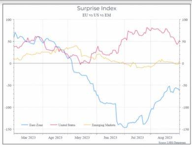 Occorre poi considerare che la partita dell’azionario europeo si gioca sullo sfondo di un deciso rallentamento economico, chiaramente anche impattato dal rallentamento cinese sopra citato: negli ultimi mesi i dati macro europei hanno costantemente deluso le attese, come conferma l’indice di sorpresa economica (grafico sotto), ovvero il paragone tra i dati attesi e quelli effettivamente pubblicati, che attualmente si trova ai minimi rispetto alla media degli ultimi 10 anni, ben al di sotto rispetto a mercati emergenti e Stati Uniti.