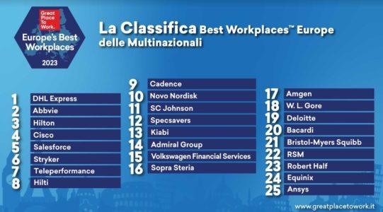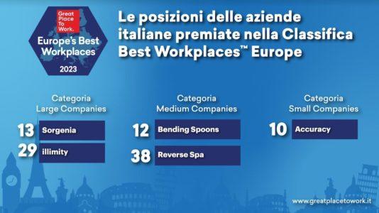 La classifica, suddivisa in 4 categorie (Multi-national Companies, Large, Medium e Small) in base al numero di collaboratori (multinazionali, oltre 500, tra 50 e 499, tra 10 e 49), ha visto le migliori organizzazioni europee ottenere, in media, un dato superiore di 11 punti percentuali (90%) rispetto a quelle premiate nelle diverse classifiche nazionali Best Workplaces (79%). Facendo invece un focus sull’Italia, il nostro Paese è al 5° posto tra quelli europei, insieme a Irlanda, Spagna e Svizzera, per numero di aziende premiate (6%), dietro a Francia (10%), Gran Bretagna (9%), Germania e Turchia (7%) e ha due imprese (Sorgenia e Illimity) che figurano rispettivamente al 13° e al 29° posto tra le 50 Best Large Companies europee. Sono altre due, Bending Spoons (12° posto) e Reverse Spa (38° posizione) le organizzazioni italiane presenti nella categoria 50 Best Medium Companies, mentre c’è solo Accuracy (10° posto) tra le aziende tricolori premiate nella categoria delle 25 Best Small Companies. Nella categoria Multi-national Companies da sottolineare, invece, come sono ben 12 le sedi italiane delle multinazionali presenti nel ranking (DHL Express, AbbVie, Hilton, Cisco, Salesforce, Stryker, Teleperformance, Cadence, SC Johnson, Sopra Steria, Kiabi, Admiral Group (ConTe.it), WL Gore, Bacardi, Bristol-Myers Squibb), a testimonianza dell’assoluta forza del tessuto imprenditoriale Made in Italy sul mercato europeo.