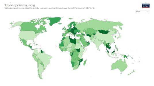 La guerra dell’Europa contro la Cina era scontata perché l’Europa ha un’economia molto più aperta (vedi grafico) e quindi rischia di perdere di più dai sussidi statali nei paesi stranieri, ma anche dal gioco della frammentazione, che è una dinamica geopolitica in cui Stati Uniti, Europa e Cina stanno tutti rimpatriando tecnologie chiave per ridurre le fragilità strategiche.