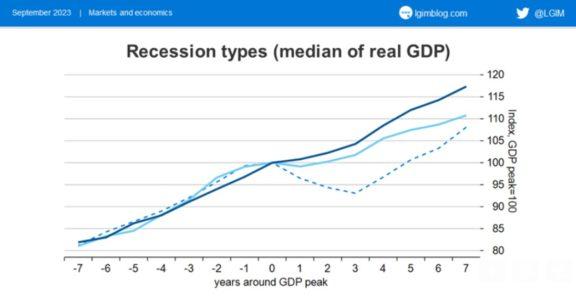Nello specifico, i dati mostrano come le recessioni comuni siano meno impattanti e quasi sempre seguite da un pieno recupero dell’economia; mentre le balance sheet recession sono più profonde e non sono mai seguite da un ritorno al trend di crescita precedente, in quanto scaturite da investimenti eccessivi, che comportano una sottoperformance dell’economia che deve riassorbire l’indebitamento. Attualmente, il caso della Cina è rappresentato dalla linea celeste.