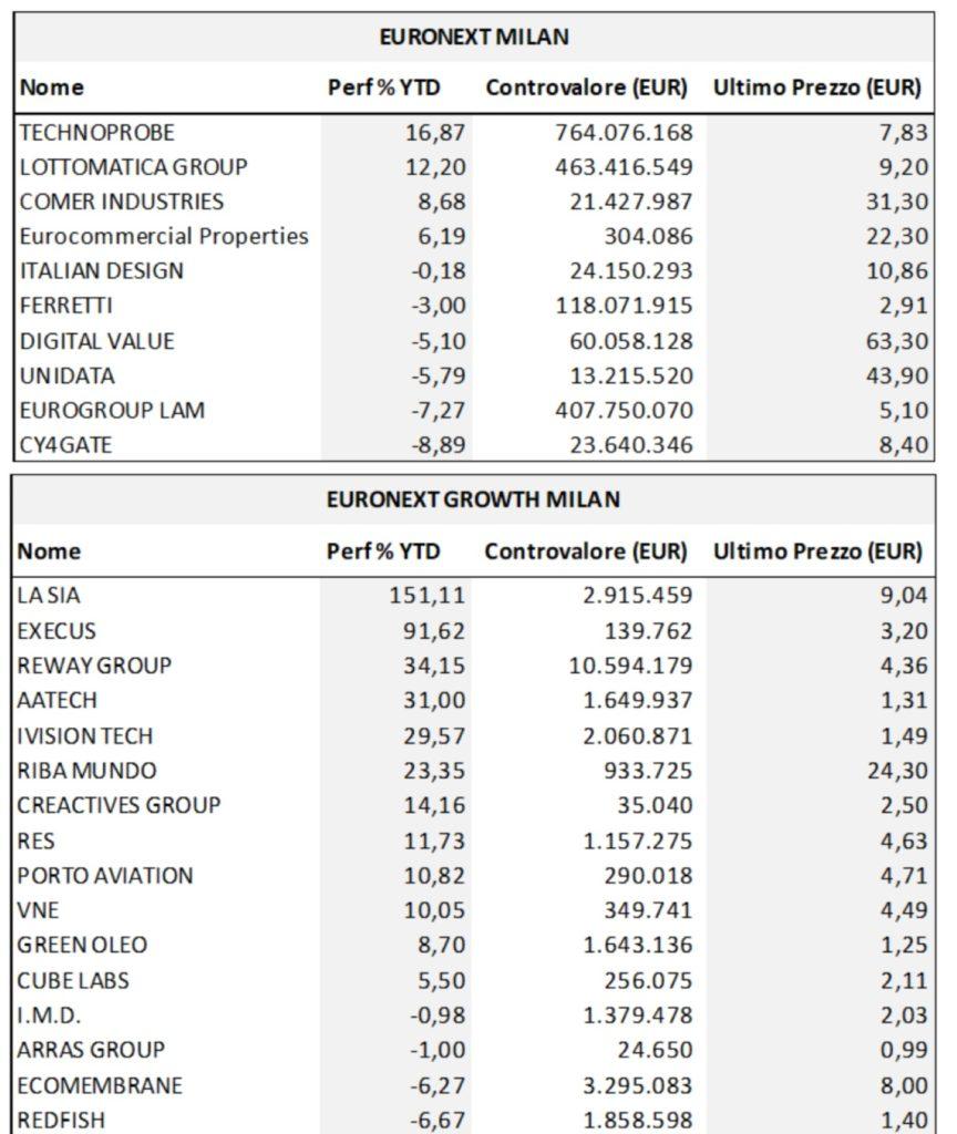 Diversamente, sul fronte Euronext Milan si segnalano le prestazioni di Technoprobe S.p.A. (+16,87%), società specializzata nella progettazione, produzione e commercializzazione di soluzioni per il collaudo di chip elettronici destinati all’industria dei semiconduttori e della microelettronica; Lottomatica Group S.p.A. (+12,20%), tra i principali leader europei e primo operatore italiano nel mercato del gioco legale autorizzato dall’Agenzia delle Dogane e dei Monopoli; e, in ultimo, Comer Industries S.p.A. (+8,68%), società specializzata nella progettazione, produzione e commercializzazione di sistemi avanzati e soluzioni meccatroniche per sistemi di trasmissione di potenza.