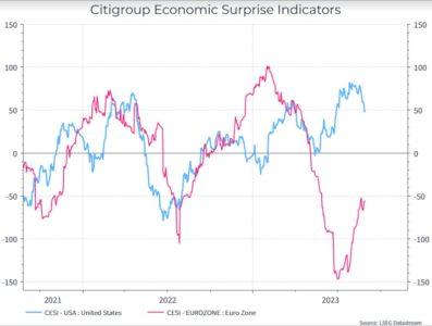 Il grafico seguente mostra gli indicatori di sorpresa economica negli Stati Uniti e nell’Eurozona, che mettono a confronto i dati macroeconomici aggregati con le previsioni degli analisti. Nel grafico possiamo apprezzare come, dopo un periodo di dati migliori del previsto, l’indicatore statunitense si stia leggermente indebolendo. L’Eurozona, al contrario, ha attraversato un periodo di dati molto peggiori delle previsioni, ma la situazione si sta gradualmente normalizzando.