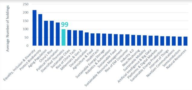 Questa tendenza a scegliere portafogli eccessivamente mirati è evidente quando si osservano i fondi multitematici/diversificati sui temi e i megatrend in Europa. Come illustrato nella Figura 1, il numero medio di partecipazioni in tali fondi è di 99 titoli… 99 titoli per investire in dieci o venti temi diversi allo stesso tempo!