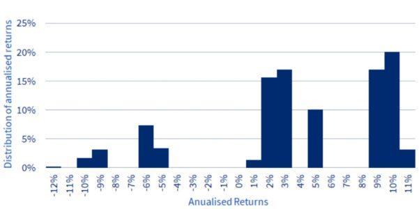 Figura 2: Distribuzione dei rendimenti annualizzati da dicembre 1998 per tutti i possibili portafogli di cinque titoli