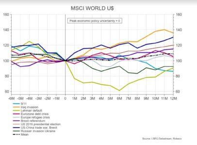 È importante riconoscere che i mercati sono agnostici e molto meno preoccupati di particolari risultati politici che del livello di incertezza che li circonda. I mercati devono dare un prezzo al livello di rischio. Questa osservazione è corroborata dal fatto che i mercati azionari sviluppati tendono al sell-off prima di un picco di incertezza politica e spesso si riprendono in seguito (vedi grafico).