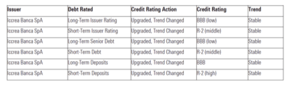 L’agenzia di rating DBRS Morningstar in data odierna ha migliorato il rating su Iccrea Banca, capogruppo del Gruppo BCC Iccrea, portandolo a livello investment grade; in particolare il rating emittente a lungo termine è migliorato a BBB (low) da BB (high) e quello emittente a breve termine a R-2 (middle) da R-3. Il trend è stabile su tutti i rating.