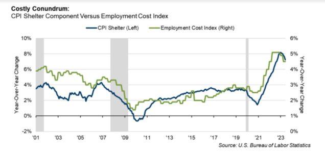 La voce “alloggi” conta per un terzo dell’Indice dei Prezzi al Consumo (Cpi) degli Stati Uniti, mentre la sottocategoria “affitti” pesa solo per il 7,6% del Cpi complessivo e l’“Owners’ Equivalent Rent” (OER), che stima i costi sostenuti dai proprietari degli immobili, per il 25,6%. Dall’agosto 2022 all’agosto 2023, l’incremento della voce di spesa legata agli alloggi (+7,2%) ha rappresentato una considerevole porzione dell’aumento complessivo dell’inflazione. Dunque, sebbene gli affitti attirino gran parte dell’attenzione mediatica, in realtà rappresentano soltanto il 7,6% del paniere, mentre l’OER ne rappresenta la componente principale; negli Stati Uniti, infatti, la maggioranza delle famiglie (circa due terzi) è proprietaria di un immobile e dunque non deve pagare un canone di locazione. Con l’Owners’ Equivalent Rent il Bureau of Labor Statistics prova a stimare il costo dei servizi abitativi, ovvero le spese per i servizi relativi alla casa, che anche i proprietari devono sostenere. Si tratta di un indice ben diverso rispetto al prezzo degli immobili, poichè rappresenta quello che una famiglia dovrebbe spendere per usufruire di un servizio simile altrove, attraverso una stima dei canoni di locazione per immobili comparabili nella stessa regione. Va precisato, però, che questa metodologia non è universalmente accettata: 11 dei 17 Paesi che fanno parte dell’Ocse non includono nell’Indice dei Prezzi al Consumo le abitazioni occupate dai proprietari. A nostro parere, tuttavia, questo metodo non è così oscuro e, anzi, potrebbe essere esteso ad altri beni e servizi su cui l’onere dell’inflazione è meglio rappresentato dal valore di una rata mensile, piuttosto che dal costo iniziale di acquisto (come, ad esempio, auto o cellulari).