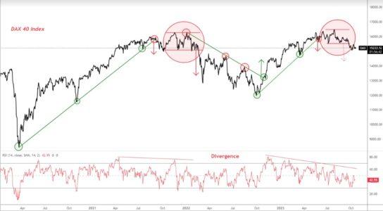 Nonostante le sfide economiche che il Paese si trova ad affrontare, l’indice tedesco di riferimento DAX 40 è scambiato vicino ai massimi storici. Tuttavia, abbiamo notato alcuni segnali preoccupanti negli ultimi due mesi, che fanno dubitare che l’attuale mercato rialzista sia sostenibile. Un’ampia divergenza ribassista si è formata per tutto il 2023, mostrando che le condizioni di slancio interno sono deboli. La linea di tendenza rialzista a lungo termine e il supporto chiave a 15.456 punti sono stati entrambi superati di recente, il che suggerisce che livelli più bassi potrebbero manifestarsi nei prossimi mesi.