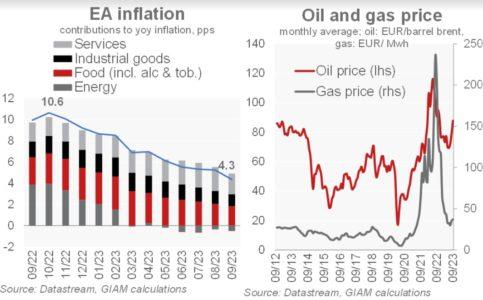 La scorsa settimana il prezzo del petrolio è salito sopra i 90 €/b Brent, un livello che non si vedeva dallo scorso novembre, mentre l’inflazione (flash) dell’area euro di settembre è scesa al 4,3% su base annua, il livello più basso da ottobre 2021. Quanto è pericoloso il picco del prezzo del petrolio per un’ulteriore disinflazione? Sulla base dei prezzi a termine, le quotazioni del petrolio dovrebbero tornare a contribuire leggermente all’inflazione da dicembre in poi. Detto questo, la pressione sull’inflazione sottostante si sta allentando, come indicato dal calo dei prezzi alla produzione (del -2,7% su base annua a luglio) e dall’attenuarsi della pressione sui prezzi alla produzione secondo le indagini congiunturali.