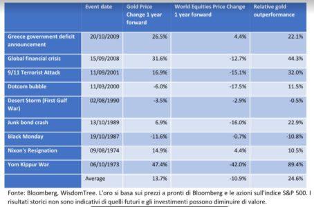 Fonte: Bloomberg, WisdomTree. L’oro si basa sui prezzi a pronti di Bloomberg e le azioni sull’indice S&P 500. I risultati storici non sono indicativi di quelli futuri e gli investimenti possono diminuire di valore.