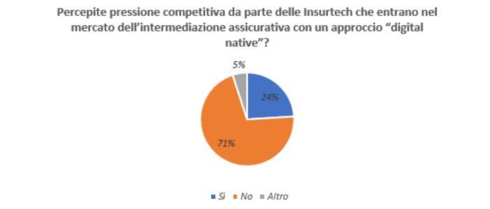 Per quanto riguarda il panorama competitivo, la maggior parte degli intervistati (71%) non vede una minaccia nelle insurtech, che entrano nel mercato dell’intermediazione assicurativa con un approccio “digital native”. Questo avviene perché i grandi Broker fanno riferimento ad un mercato diverso da quello consumer in cui la consulenza e la personalizzazione rappresentano ancora il vero fattore differenziante.