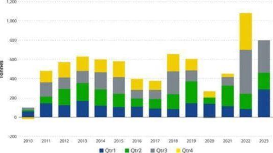 Domanda delle Banche centrali – Uno dei principali fattori che hanno spinto al rialzo i prezzi dell’oro quest’anno sono stati i forti acquisti netti da parte delle Banche centrali, potenzialmente destinati a superare i livelli record registrati nel 2022. Al contrario, la domanda di investimenti, di solito il principale motore di un rally del prezzo dell’oro, è diminuita in modo significativo quest’anno (-7% da inizio anno), misurato in base agli ETF che detengono oro fisico. Senza un altro centro di domanda di titoli auriferi per compensare la mancanza di domanda di investimento, il clima di sfiducia del mercato e l’apatia nei confronti dell’oro hanno avuto un impatto molto maggiore sui titoli auriferi. In altre parole, le Banche centrali comprano oro, non comprano titoli auriferi; se lo facessero, forse anche i titoli godrebbero di maggiore sostegno in questo contesto