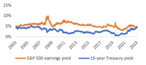Grafico 1: Earning yield dell’S&P 500 rispetto ai Treasury a 10 anni (2003 – 2023)