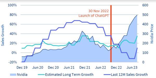 L’intelligenza artificiale nel 2023 ci offre un esempio. Chiaramente, molti titoli legati all’IA hanno beneficiato del lancio di ChatGPT a novembre 2022 e hanno registrato performance stellari. In seguito a questa notizia, tutti i titoli legati all’IA hanno guadagnato terreno. Nvidia, ad esempio, ha ottenuto il 168,7% dal 30 novembre 2022 (data di lancio di ChatGPT) al 13 ottobre 2023. Osservando la Figura 1, abbiamo cercato di collegare la performance di Nvidia nel 2023 ai suoi fondamentali. Ovviamente, tale performance non è stata “trainata da Nvidia”, non è stata il risultato di fondamentali particolarmente interessanti. Molti investitori che abbiamo incontrato nelle ultime settimane hanno infatti ripetutamente sottolineato che, alla fine del 2022, Nvidia era decisamente poco interessante dal punto di vista della valutazione e della crescita. Quindi, la domanda è: sarebbe valsa la pena non investire nell’IA alla data di lancio di ChatGPT perché i fondamentali non erano abbastanza interessanti o perché i relativi titoli erano costosi? Oppure si sarebbero dovuti trascurare i fondamentali per beneficiare del ciclo virtuoso creato per questi titoli dal lancio di ChatGPT? Per noi la risposta è chiara.