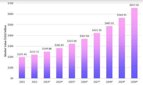 Il mercato globale della cybersecurity è stato valutato a 222 miliardi di dollari nel 2022. Entro il 2030, si prevede che supererà i 657 miliardi di dollari, con un CAGR di circa il 13%.