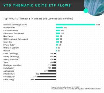 A novembre, i flussi in entrata negli ETF tematici UCITS sono stati pari a 270 milioni di dollari. Al netto del solito Robotica, Automazione e AI (160 milioni di dollari), flussi significativi sono arrivati sul tema Clima e Ambiente negli USA (71 milioni), a dimostrazione di una tendenza emergente in cui gli investitori cercano specifiche allocazioni geografiche all’interno dei temi ambientali.