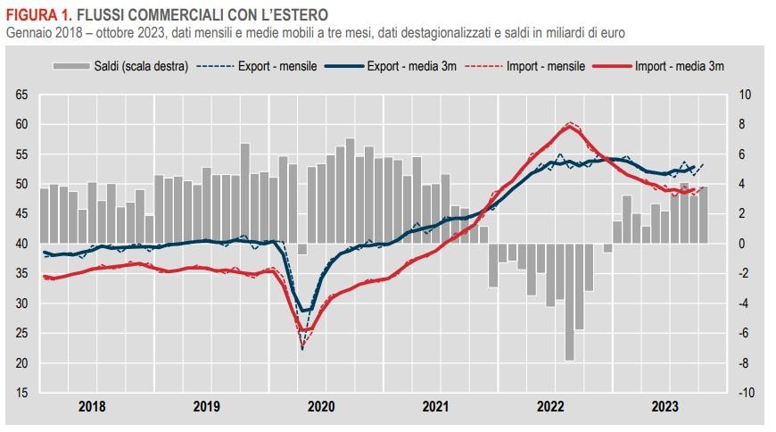Nel trimestre agosto-ottobre 2023, rispetto al precedente, l’export cresce del 2,4%, l’import dello 0,5%.