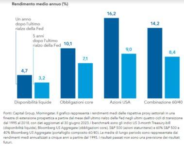 Dopo gli ultimi quattro cicli di irrigidimento della Fed, azioni e obbligazioni hanno nettamente superato i rendimenti dei buoni del Tesoro statunitensi a 3 mesi nel primo anno successivo all’ultimo rialzo della Fed. Per contro, il rendimento dei Treasury a 3 mesi – un titolo di riferimento con un rendimento analogo a quello degli investimenti assimilabili alla liquidità – è rapidamente sceso in media del 2,5% nei 18 mesi successivi all’ultimo intervento della Fed.