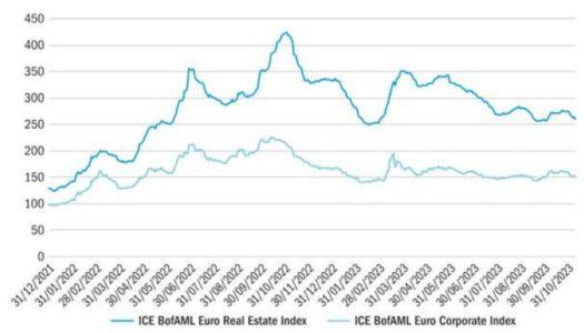 L’annus horribilis del 2022 ha visto gli spread delle obbligazioni investment grade (IG) del settore immobiliare europeo allargarsi di quasi 300 punti base al loro picco, rispetto ai 125 punti base dell’investment grade (IG) europeo nel suo complesso. Nonostante la ripresa nel 2023, gli spread delle obbligazioni immobiliari IG rimangono ancora al doppio del loro livello iniziale del 2022 e con un premio molto più ampio rispetto al resto del mercato IG europeo.