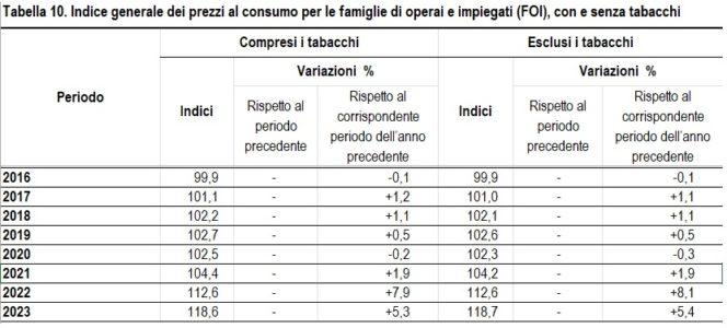 L’indice nazionale dei prezzi al consumo per le famiglie di operai e impiegati (FOI), al netto dei tabacchi, aumenta dello 0,2% su base mensile e dello 0,6% rispetto a dicembre 2022. La variazione media annua del (FOI), al netto dei tabacchi, del 2023 è pari a +5,4% (era +8,1% nel 2022).