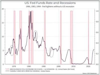 È insolito assistere a un ciclo di aumento dei tassi significativo che non provochi una recessione, ma non è un caso isolato. Il grafico seguente illustra il punto. Mostra il tasso dei Fed Funds e le recessioni “ufficiali” degli Stati Uniti. Si può notare che l’inasprimento della politica monetaria ha spesso preceduto le recessioni, come ci si potrebbe aspettare, ma che in almeno tre occasioni (1966, 1983 e 1994) l’aumento dei tassi non ha provocato una recessione.