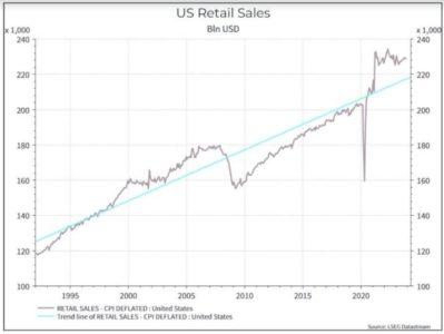 La strada è ancora lunga, ma il miglioramento è stato chiaramente visibile. Ciò dovrebbe consentire alla Federal Reserve di ridurre i tassi a un certo punto nel 2024, anche se non è chiaro il momento preciso. In secondo luogo, dobbiamo riconoscere la resistenza della domanda dei consumatori. Il grafico sottostante mostra le vendite al dettaglio aggiustate per l’inflazione. Dopo la ripresa post-COVID, le vendite al dettaglio sono rimaste ben al di sopra del loro trend di lungo periodo. Ci si potrebbe aspettare un ritorno a tale tendenza.