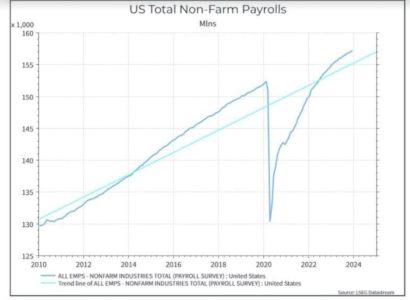 Ma se mettiamo da parte tutti questi rischi, le prospettive per l’economia statunitense nel 2024 rimangono abbastanza favorevoli e la Fed, che si sarebbe certamente presa la colpa di una recessione nel 2023, può respirare un po’ più tranquillamente.