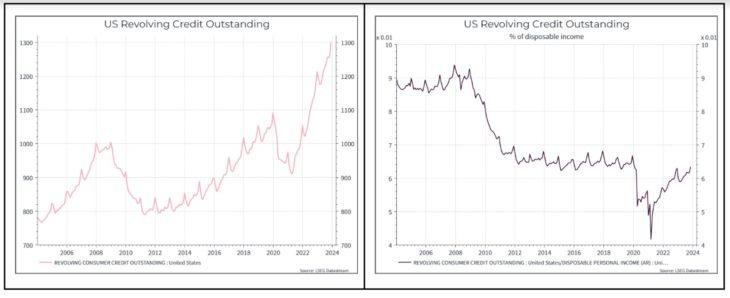 Ma i segnali provenienti dal credito al consumo sono ancora un po’ contrastanti. Se guardiamo al suo livello assoluto, sembra alto, ma se consideriamo il credito come percentuale del reddito disponibile (grafico di destra), sembra molto più gestibile.