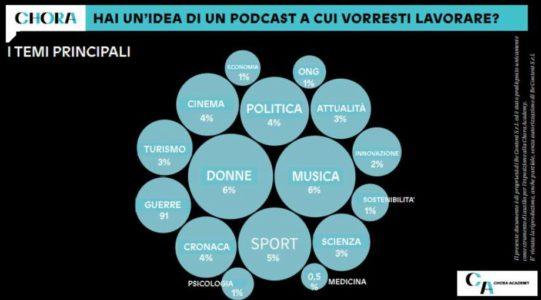 Quali sono stati i temi più comuni? Innanzitutto quello delle donne (6%): un dato non sorprendente, dal momento che la maggior parte delle persone candidate era di genere femminile e dal momento che i podcast stanno diventando sempre di più uno spazio dove le donne affrontano in modo intimo argomenti che sentono riguardarle. Anche la musica è stato un tema citatissimo (6%), nonostante tutte le complicazioni legali che comporta l’utilizzo di musica non proprietaria nei podcast. Poi, lo sport (5%), tema ancora poco battuto nei podcast. E, in pari percentuale (4%), la politica, la cronaca e il cinema.