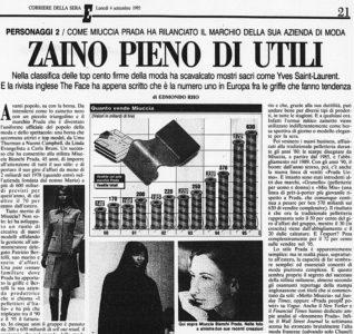 Ecco un breve estratto dell’articolo pubblicato nel 1995: “Lo stile Prada nel mondo è spesso associato a un’estetica moderna, innovativa e sofisticata. Il marchio Prada è noto per la sua capacità di mescolare elementi classici e contemporanei, creando design distintivi e riconoscibili.