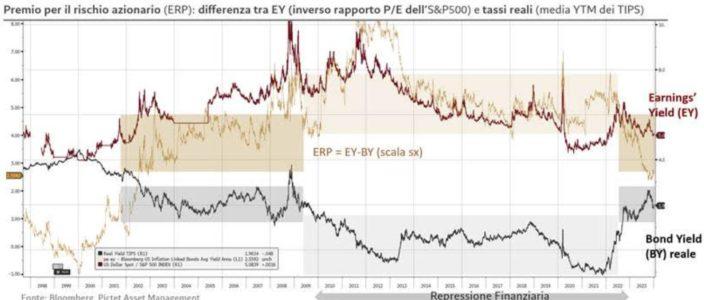 Il secondo valore da considerare è il Prezzo/utili: quello che si è visto è un enorme re-rating degli USA rispetto al resto del mondo. Rispetto agli ultimi dieci anni, il P/E USA si è collocato nell’ultimo anno ampiamente sopra la media (+17%), diversamente da altre aree del mondo come il Regno Unito (-18%), tradizionalmente uno dei mercati più a sconto dal punto di vista valutativo, o Hong Kong (-23%). che si trovano in una situazione diametralmente opposta. Sul piano settoriale, è evidente l’eccezionalità del settore IT, che nell’ultimo anno ha visto valori superiori del 39% rispetto all’ultimo decennio, e che chiaramente va di pari passo con l’eccezionalità degli Stati Uniti. Di contro, l’Energy ha rappresentato il comparto a sconto, in quanto ciclico e succube della retorica ESG (-36% rispetto alla media del decennio). Se guardiamo il P/E in termini reali, ovvero confrontandolo con il suo inverso che è l’earning yield, se ne trae un premio al rischio (ERP) contenuto per l’equity. Il premio richiesto oggi per investire in azioni si colloca al 3%, circa la metà dell’ERP a trent’anni che si colloca invece intorno al 5,5%. A che livelli di utili questo ERP è ancora sufficiente per gli investitori? Per rispondere è necessario valutare il livello dei tassi reali a lungo termine (di cui sono una buona proxy i tassi dei T bond decennali oggi all’1,8%) e, considerando un P/E medio intorno a 20, possiamo concludere che l’EPS annuo che rende un premio a rischio del 3% accettabile si colloca su una media di 230 dollari; la stima di consenso è oggi di 239 dollari. Si tratta quindi di un valore che è compatibile con l’utile atteso e pertanto non giustifica, in questo momento, una presa di profitto sull’azionario basata puramente su motivi valutativi.