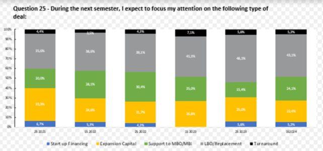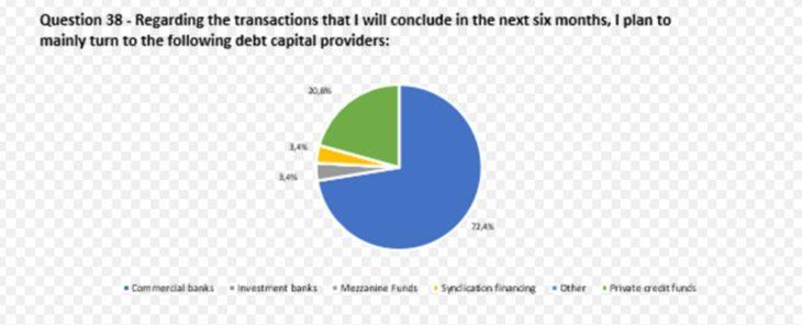 È interessante notare come, a testimonianza di una forte domanda per fonti di finanziamento alternative e a fronte di una diminuzione di debito bancario disponibile, il 20,8% dei rispondenti dichiara che si rivolgerà a fondi di private credit come strumento di acquisition financing. Durante il prossimo semestre, tale fonte di finanziamento sarà seconda solamente alle banche commerciali, scelte dal 72,4% degli operatori.