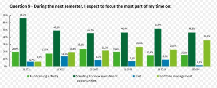 Nonostante l’indicatore di ottimismo degli operatori sia in linea con quello del semestre passato, per la prima metà del 2024 cresce notevolmente la quota di chi prevede di dedicarsi ad attività di gestione del portafoglio, attestandosi al 36,2%, valore più alto registrato dal 2020 ad oggi. Scende invece significativamente la quota di chi si dedicherà alle attività di exit, dal 9,6% all’1,7%, a comprova del fatto che gli operatori non ritengono ancora il momento attuale come il migliore per cedere i propri investimenti, come confermato anche dai dati che evidenziano le aspettative sui multipli di mercato ancora in calo da parte del 67,3% degli intervistati.