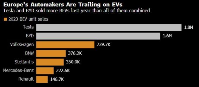 Grafico: le vendite di BYD e Tesla in confronto a quelle delle Case europee, Bloomberg, L.P. Fonti: Bloomberg, BYD, Financial Times.