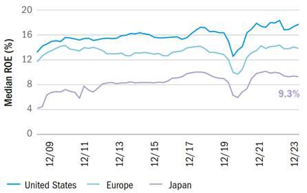 Figura 2: Il ROE del Giappone si sta avvicinando ai livelli di Stati Uniti ed Europa